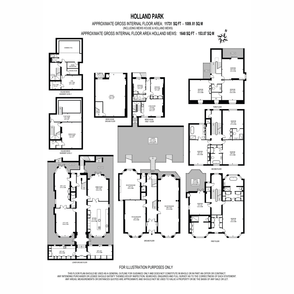 The Grade II listed main house (extending to 11,731 Sq Ft) is arranged over five floors and two further basement levels, with gracious reception rooms on the ground floor, an extensive master bedroom suite on the first floor and six further bedrooms to the upper floors. There are five further reception rooms, a kitchen/breakfast room and additional staff accommodation. To the rear is a roof terrace at first floor level and an attractive lawned garden. The basement levels offer facilities expected in a house such as this, these include: a swimming pool, steam room, gym, cinema and wine cellar.